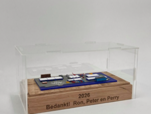 Voor relatiegeschenken in de techniek of offshore voegen we vaak details toe in TPU. Denk aan de banden van een miniatuurvoertuig of de flexibele kabels van een kraanmodel. Deze materialen zorgen ervoor dat het geschenk niet alleen mooi is om naar te kijken, maar ook ‘hufterproof’ is en tegen een stootje kan.